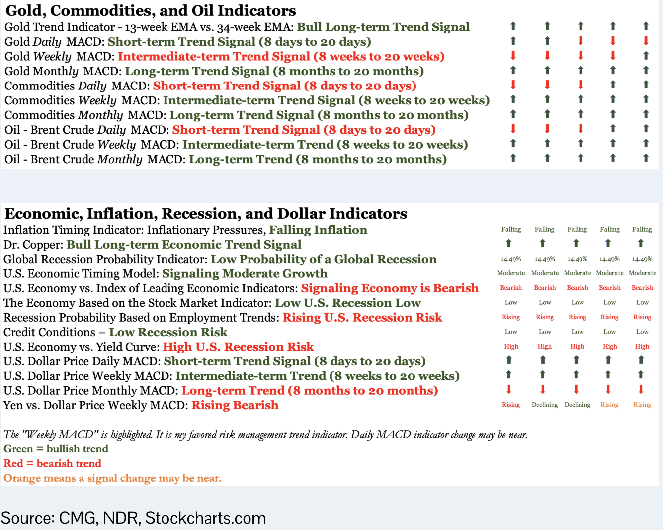 The green text and arrows indicate a bullish trend, red indicates a bearish trend, and orange means a change in trend is near. The last four weeks are shown to give you a sense of trends and changes. The lower section looks at Economic, Inflation, Recession, and Currency indicators. Remember, this is a weekly dashboard to provide a broad perspective on what is happening. I plot the information each week to help me keep a finger on the pulse of the markets.
