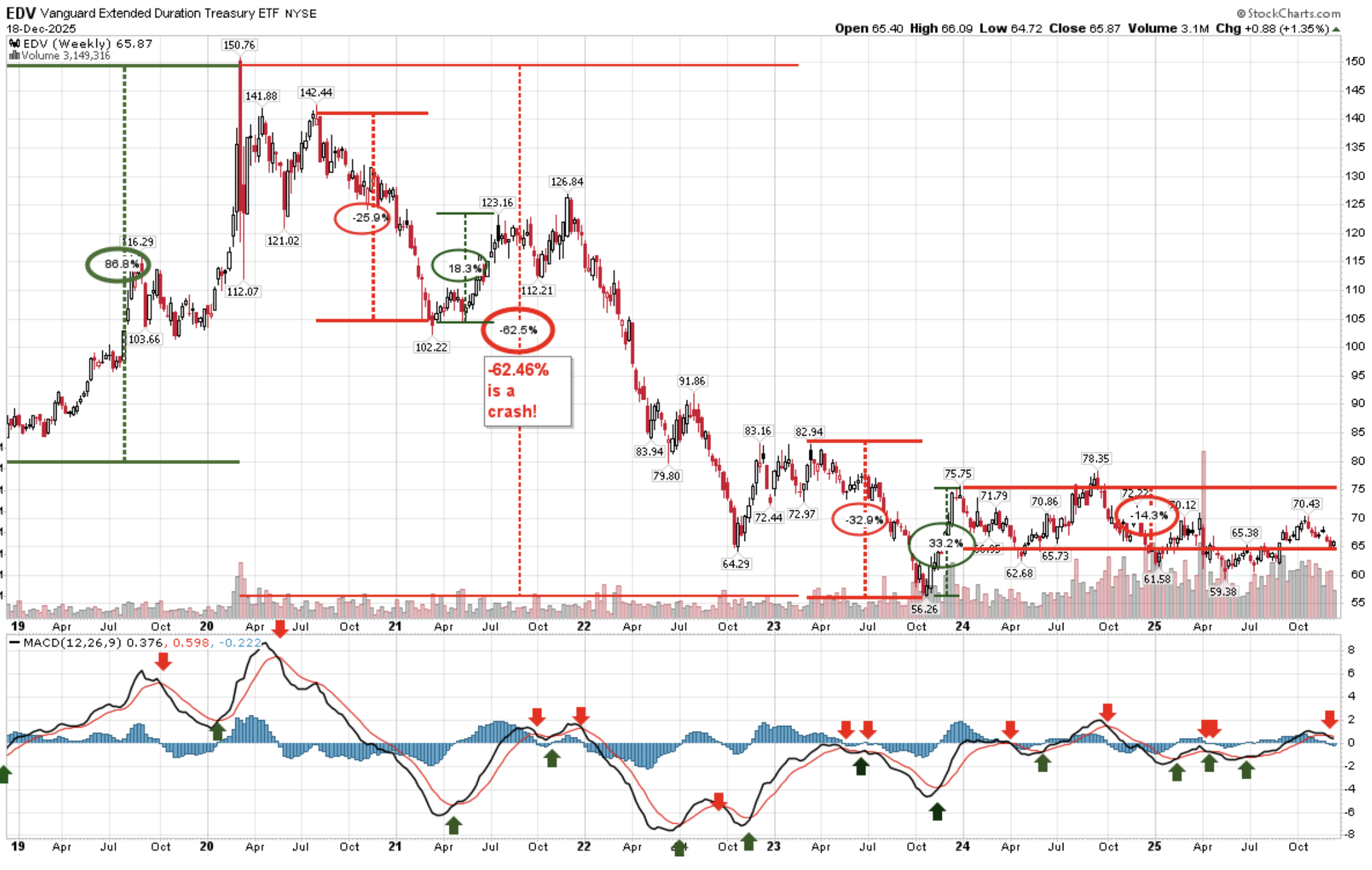 Lastly, I highlighted the approximate return for EDV for 2025. Currently down ~ 14.3%. (red circle, middle right in chart)