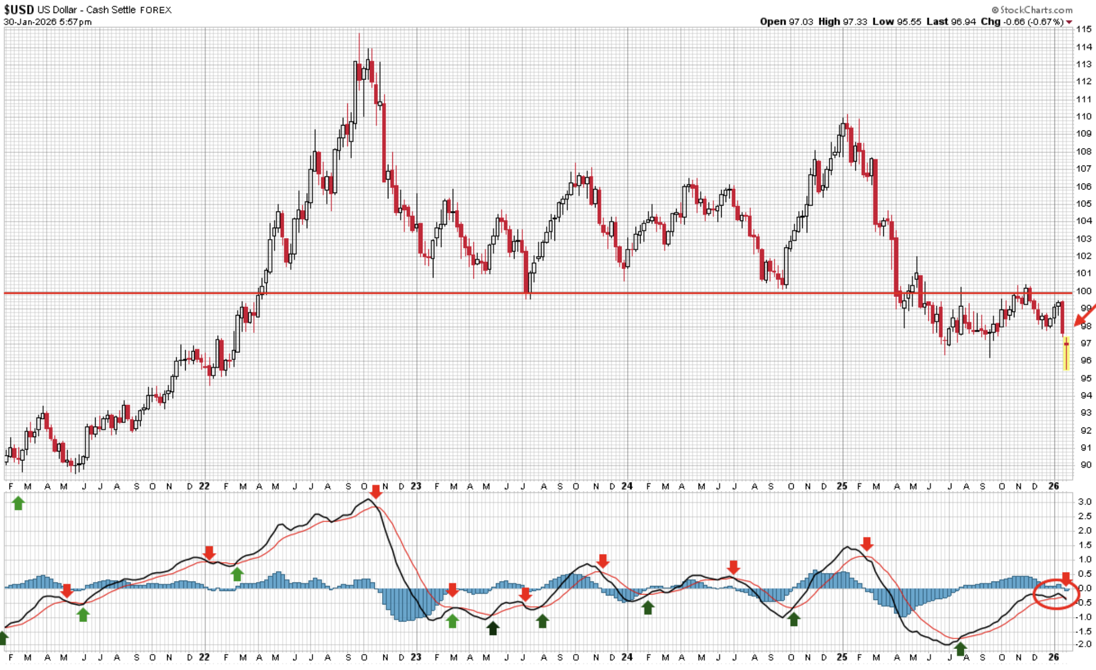 The red arrow to the right points to the dollar reaction. Look at the spike lower and the new Weekly MACD sell signal. In trading today, the dollar is trying to hold on. Oh my.