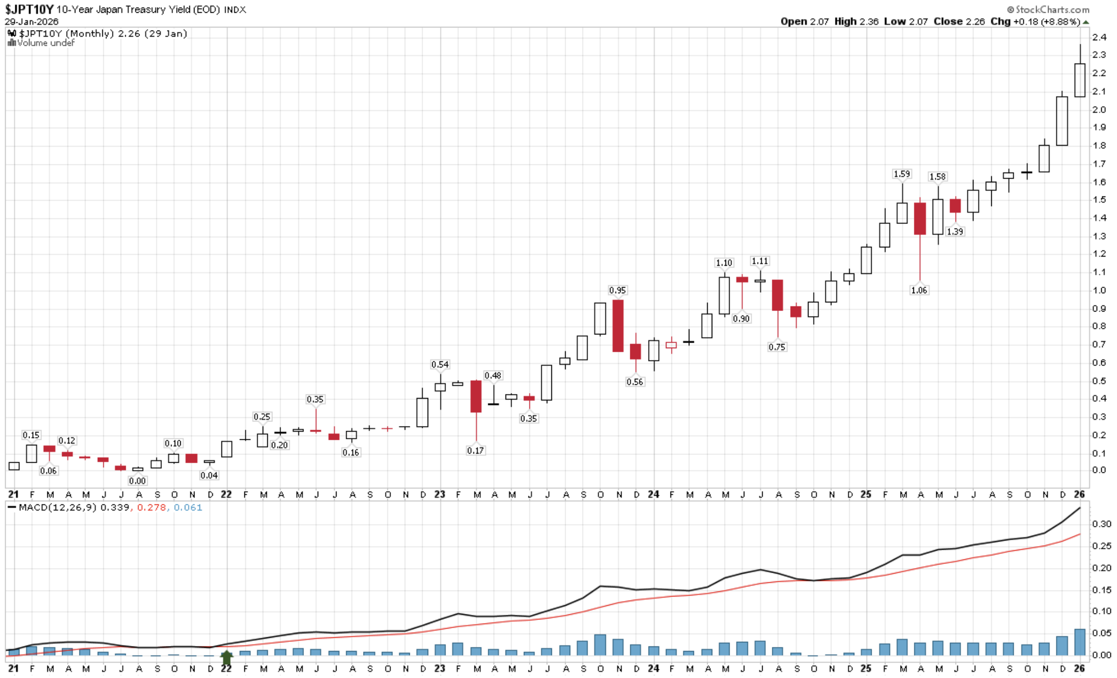 Following is a look at the 10-year Japanese Government bond yield. The yield has increased from 0.10% (basically free money) to 2.26% in the last three years.