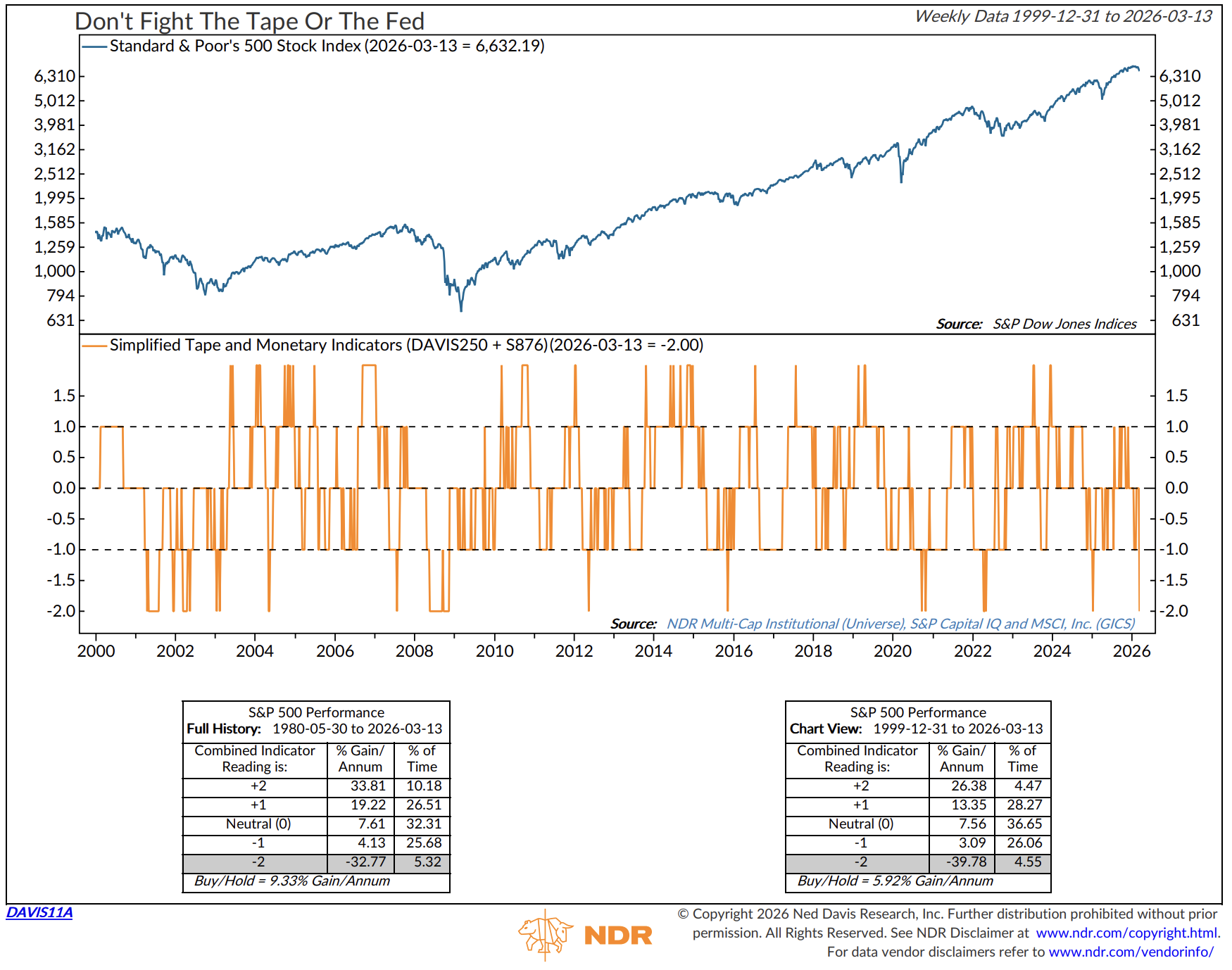 The next chart was designed to test the old adage, “don’t fight the trend or the Fed.” In this case, the tape (or price trend) is measured by NDR’s Big Mo composite indicator, and the Fed is measured by price action in Treasuries.