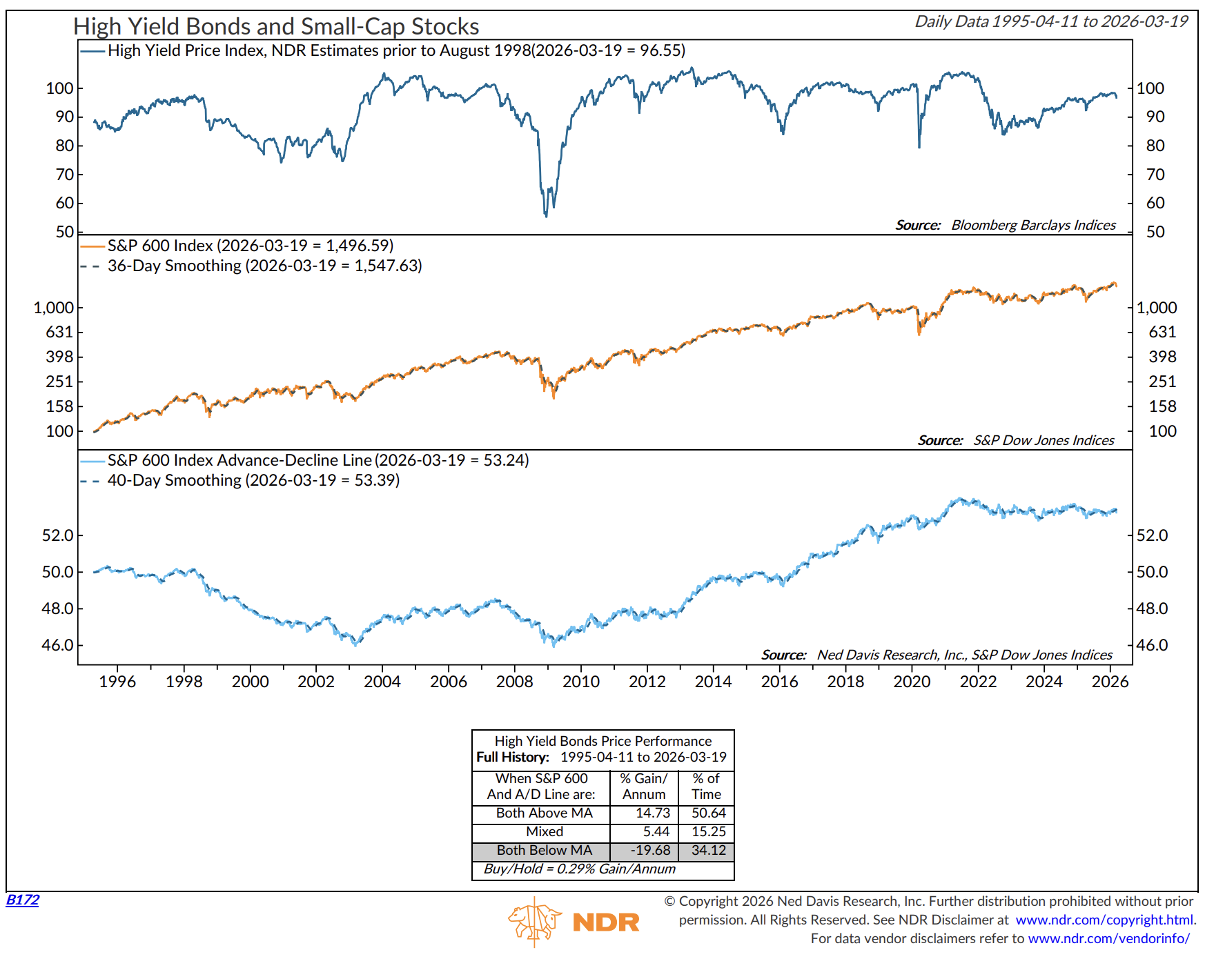 When small-cap trends are positive and breadth is expanding, high-yield prices tend to move higher as well. When those trends roll over, junk bonds often follow.