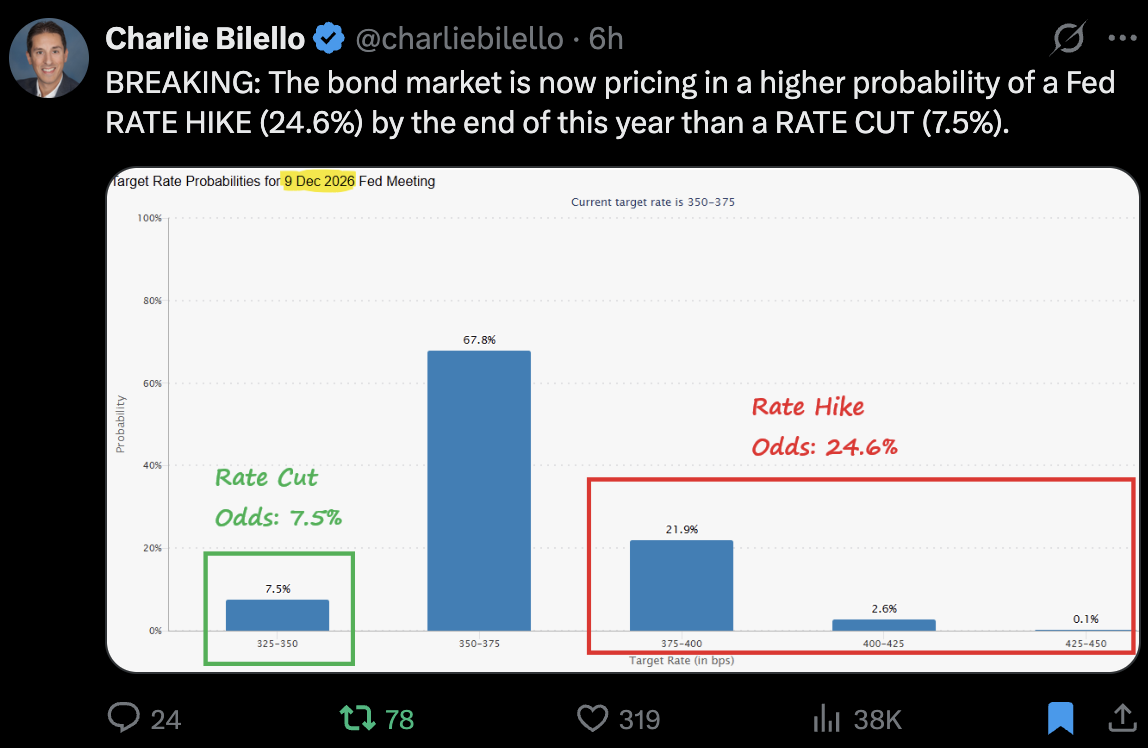 Pressure is building: Energy costs are rising, supply chains are being affected, and global tensions are impacting sentiment. Complicating the job of the Fed. Odds now favor a rate increase before a rate decrease. I retweeted this earlier today:
